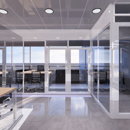 Diseño de oficinas con una paleta de colores predominantemente en blanco, creando un ambiente luminoso y moderno. Se proponen amplios ventanales para maximizar la entrada de luz natural y mantener las oficinas cálidas y acogedoras, complementadas con luminarias blancas. Los espacios divisorios en cristal brindan una sensación de amplitud y conectividad visual. Las oficinas se caracterizan por su amplitud y excelente movilidad, proporcionando un entorno de trabajo cómodo y funcional.