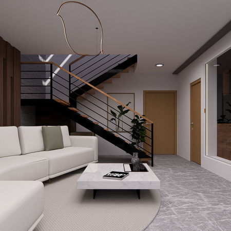 Diseño de casa habitación en donde se utiliza una mezcla entre un estilo moderno y rustico, donde se usa una paleta de colores claros como el gris y el blanco, al exterior se utilizan acabados simples en colores claros, los cuales hacen contraste con los acabados en piedra ubicados en la terraza del patio trasero, además de hacer uso de lambrines tipo madera combinados con vegetación para generar un ambiente de relajación al espacio. En el proyecto se priorizan los espacios abiertos que transmitan un ambiente de tranquilidad, en la estancia se propone un entramado de madera combinado con un muro en un tono diferente a los demás acabados haciendo que resalte el espacio, de igual forma la estancia cuenta con una conexión directa con el comedor y el cancel que conduce a la terraza generando una vista panorámica de todo el espacio interior además de percibirlo más grade. En la cocina se propone una isla en acabados tipo mármol, la cual forma parte del área de preparación además de generar una barra desayunador, el resto de la cocina cuenta con las dimensiones necesarias para su correcto funcionamiento, además de contar con una correcta iluminación natural y artificial. Las habitaciones cuentan con un diseño de plafón que permita percibirlas más grandes de lo que en realidad son, además de resaltar el muro de la cama con un tono distinto al resto.