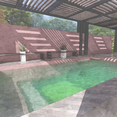 Diseño de terraza en donde se hace uso de una pérgola de acero y madera, la cual cubre un área de piscina, esta ultima esta propuesta en un área más elevada la cual hace destacar la piscina, fuera de la pérgola se propone una estancia exterior cubierta con una sombrilla teniendo un acabado en piso en piedras.
