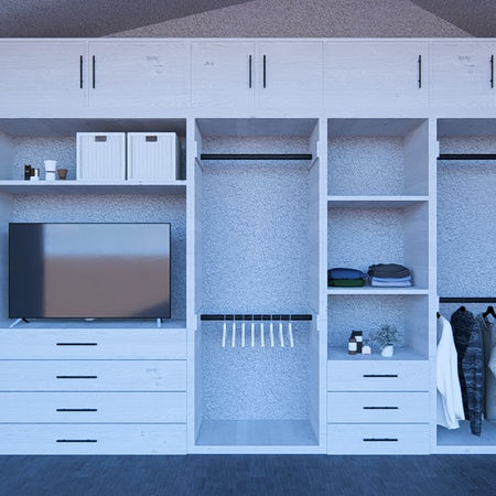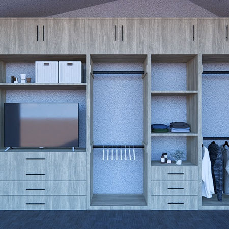 Diseño de closet adaptable en tipos de acabados, secciones de almacenamiento y puertas. Cuenta con un espacio dedicado para Pantalla de TV lo que le permite ser colocado en el muro principal de la habitación frente a la cama sin provocar problemas de visualización o almacenaje.