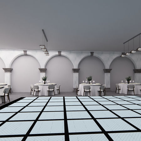 Diseño de salón de fiestas de estilo moderno con interiorismo neoclásico/moderno donde se emplean tonalidades claras y acentuaciones en tonos oscuros, destacando el uso de elementos de lambrin con acabado madera.