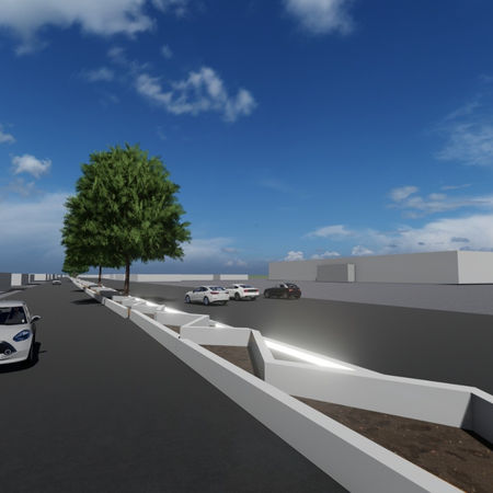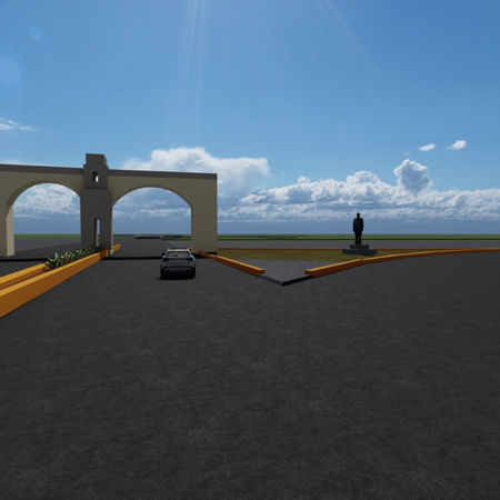 Diseño urbano del acceso al camino de Zinacantepec, se propone una jardinera geometrizada e iluminada divisoria de los carriles automovilísticos principales, unas puertas de acceso monumentales de carácter rustico en tonalidades claras y una glorieta con juego de niveles donde se enmarca una escultura emblemática de la región de acabado luminoso rodeada por un muro curvo de concreto pulido coronado por las letras del municipio de Zinacantepec.