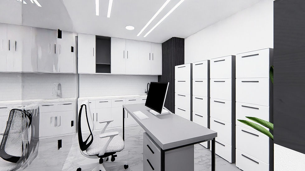 Diseño de clínica médica de estilo moderno, donde se emplean tonalidades claras y grisáceas, se denota la iluminación blanca que con el acabado de piso en tonalidades de mármol claro se ambienta de manera uniforme el espacio.