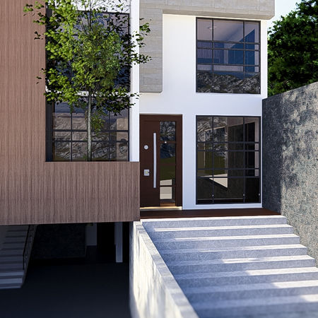 Vivienda de estilo moderno-contemporáneo con un diseño arquitectónico que destaca por su composición volumétrica limpia y contrastante. La fachada presenta una mezcla de materiales naturales y sintéticos, incluyendo recubrimientos de madera, piedra y concreto blanco, que aportan textura y carácter.