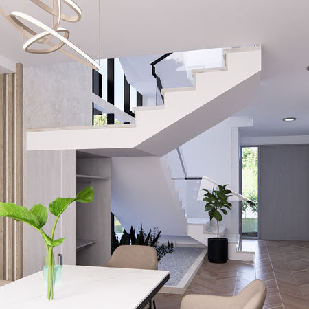 La planta baja integra un garaje techado para dos vehículos, delimitado por un pórtico oscuro que le otorga profundidad y jerarquía visual. El acceso peatonal se distingue por una puerta de gran formato en acabado claro, acompañada de ventanales horizontales que favorecen la ventilación e iluminación natural.