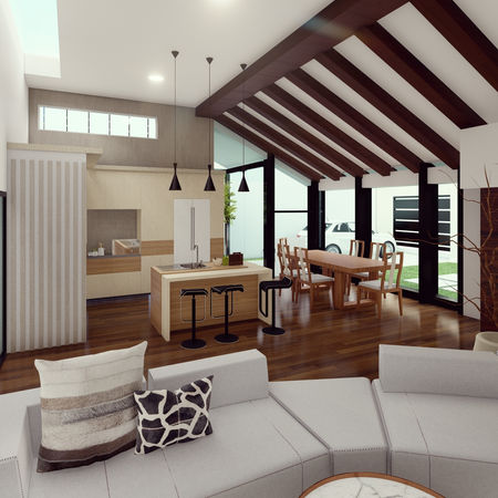 Este loft cuenta con dobles alturas y vigas de madera que brindan un toque rústico y natural a esta vivienda. Aquí también se integra una ampla área especial para los perros, en donde libremente pueden dormir, comer, jugar, correr e incluso entrar y salir de la vivienda cuando ellos lo deseen. Su estilo es simple, sutil y elegante. Con acabados de lujo, pero sin ser ostentosos. Esta vivienda cuenta con múltiples entradas de luz natural y vistas hacia el exterior; sin dejar de lado la seguridad, pues en su perímetro cuenta con cerca electrificada y muros altos que impiden la vista y el paso de personas no deseadas.
