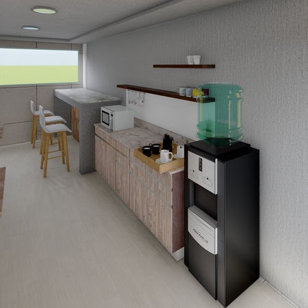 Sala de juntas con diseño serio, utilizando colores neutros, mobiliario sencillo y luces LED, aprovechando de la ventilación e iluminación natural por medio de las ventanas, además de contar con pequeño espacio de descanso y preparación de alimentos.