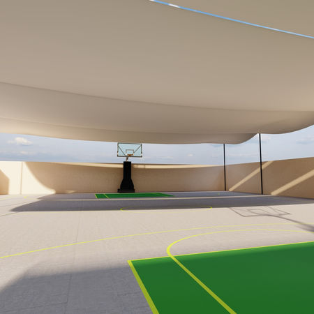 Se diseña una cubierta con una forma diferente, atrayendo a los niños a hacer deporte sin la preocupación del daño que ocasionan los rayos del sol, ofreciendo un área espaciosa para realizar diversas actividades.